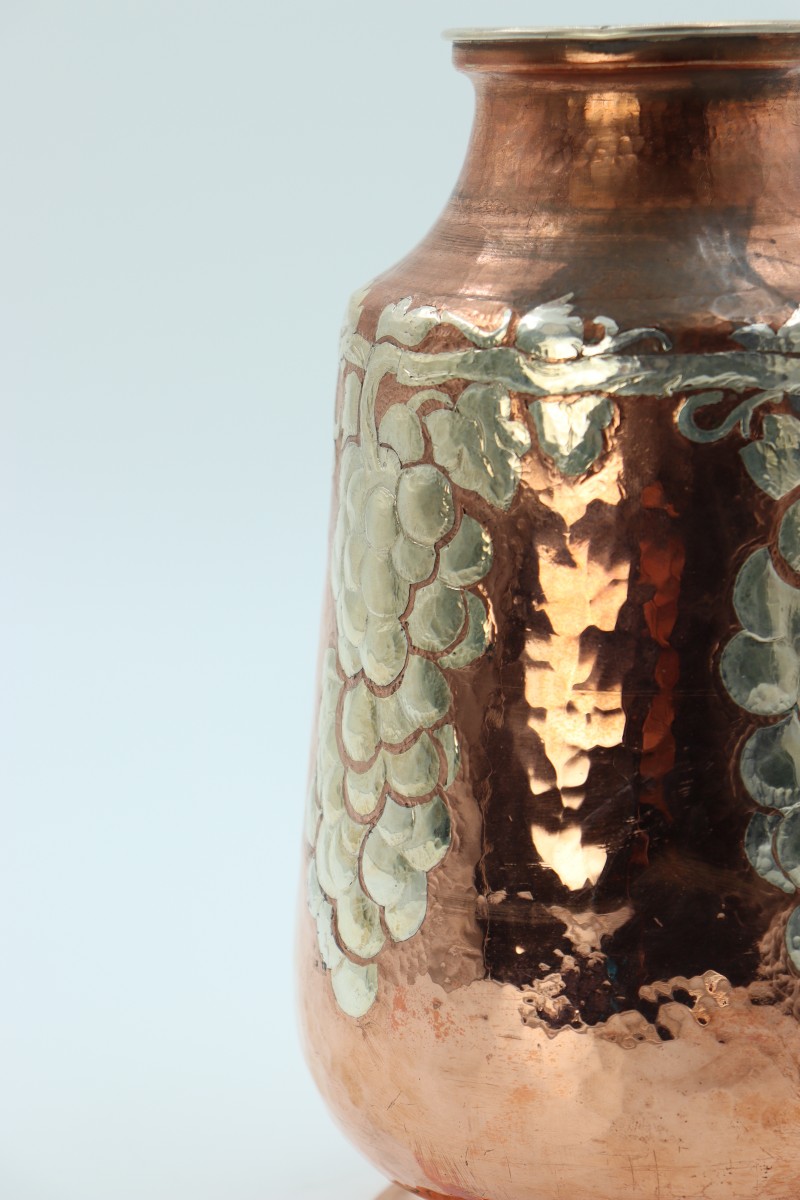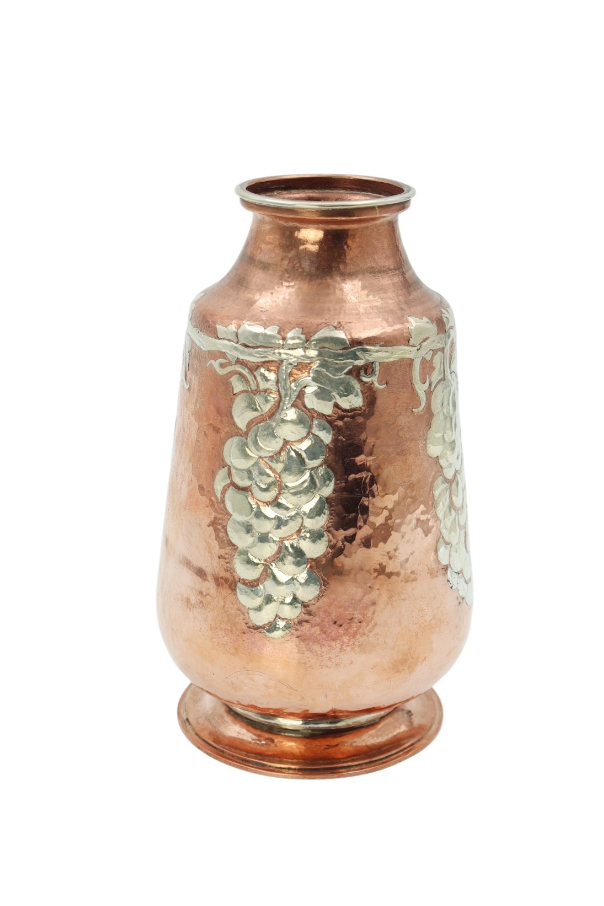 Vase en dinanderie martelé à décor de vignes en métal argenté par Jean Serrière, signé des initiales de l'artiste J.S et cachet de fondeur A. Hebrard Paris
