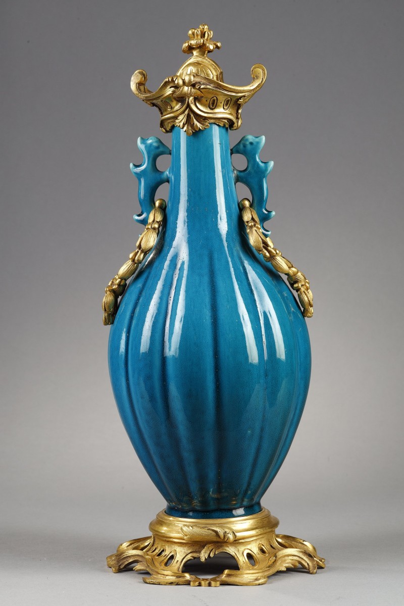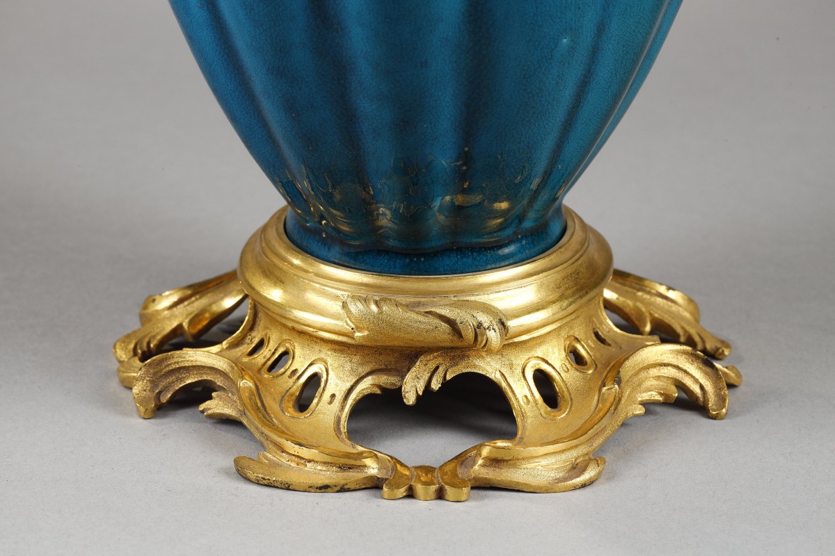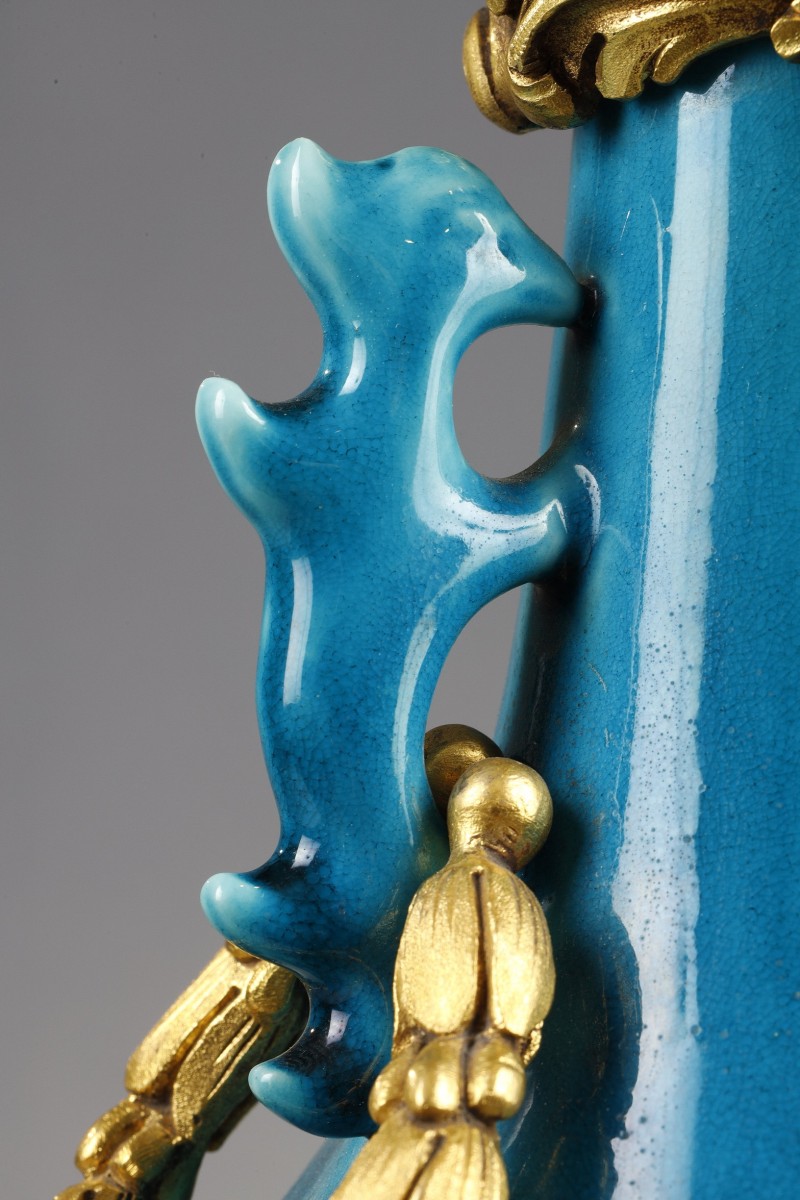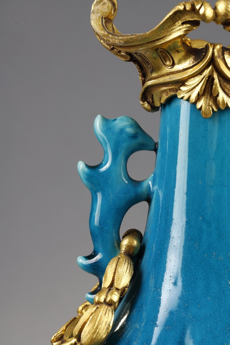 Le vase repose sur une base ajourée à volutes rocailles, en bronze doré.