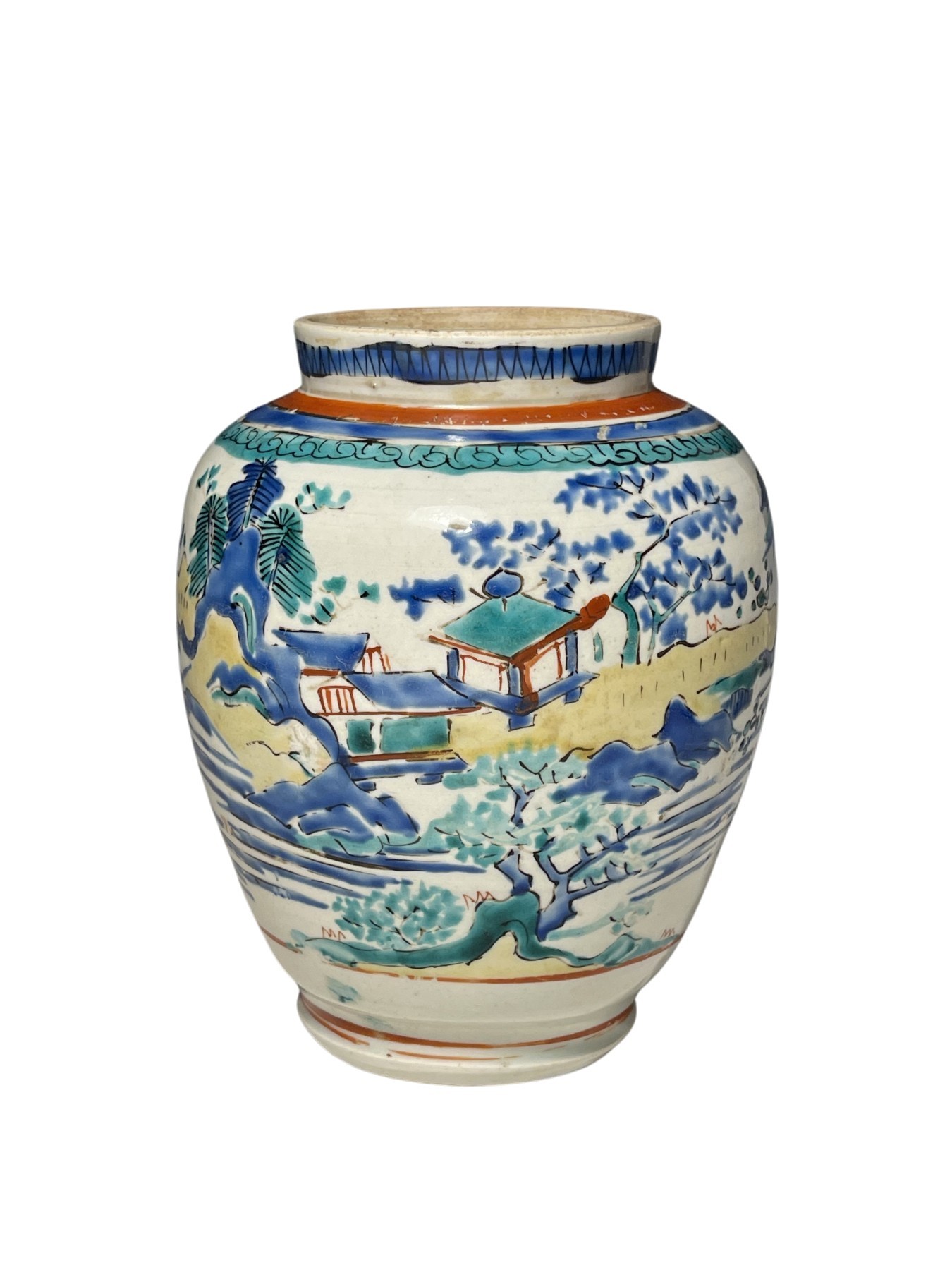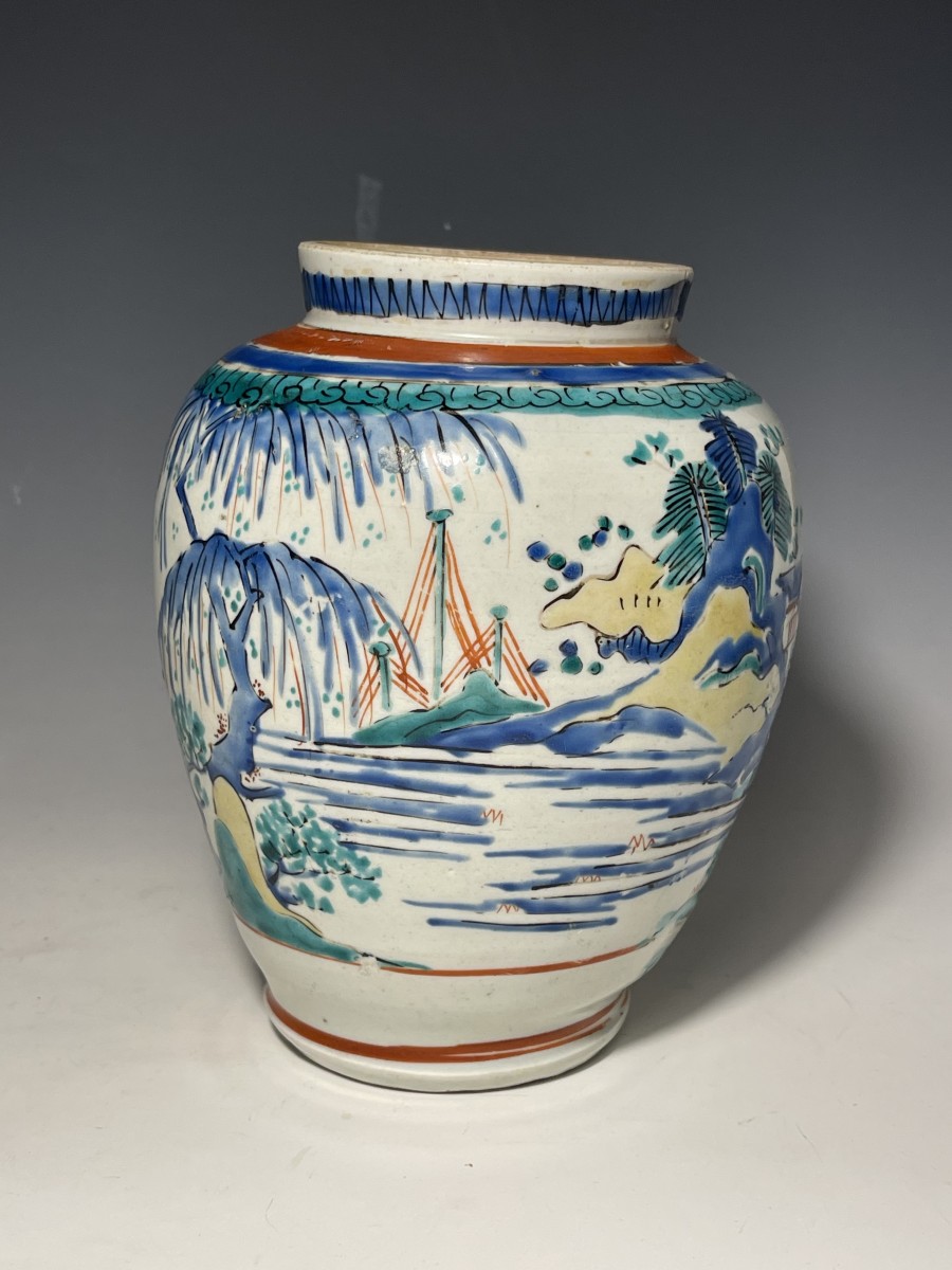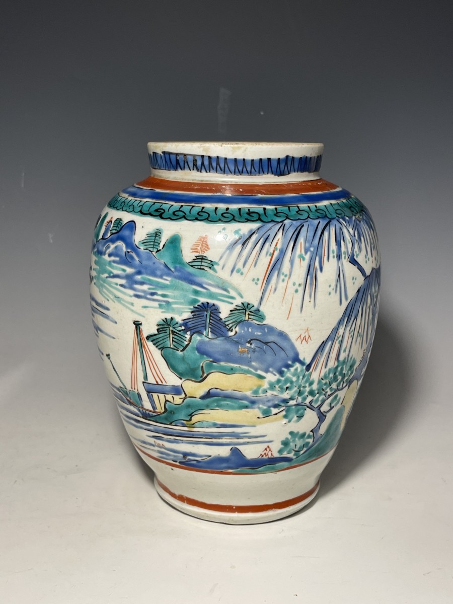 Vase en porcelaine du Japon, décor polychrome de paysages tournants de type proto-Kakiemon. Haut. 19cm Vers 1660-80