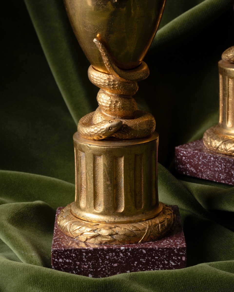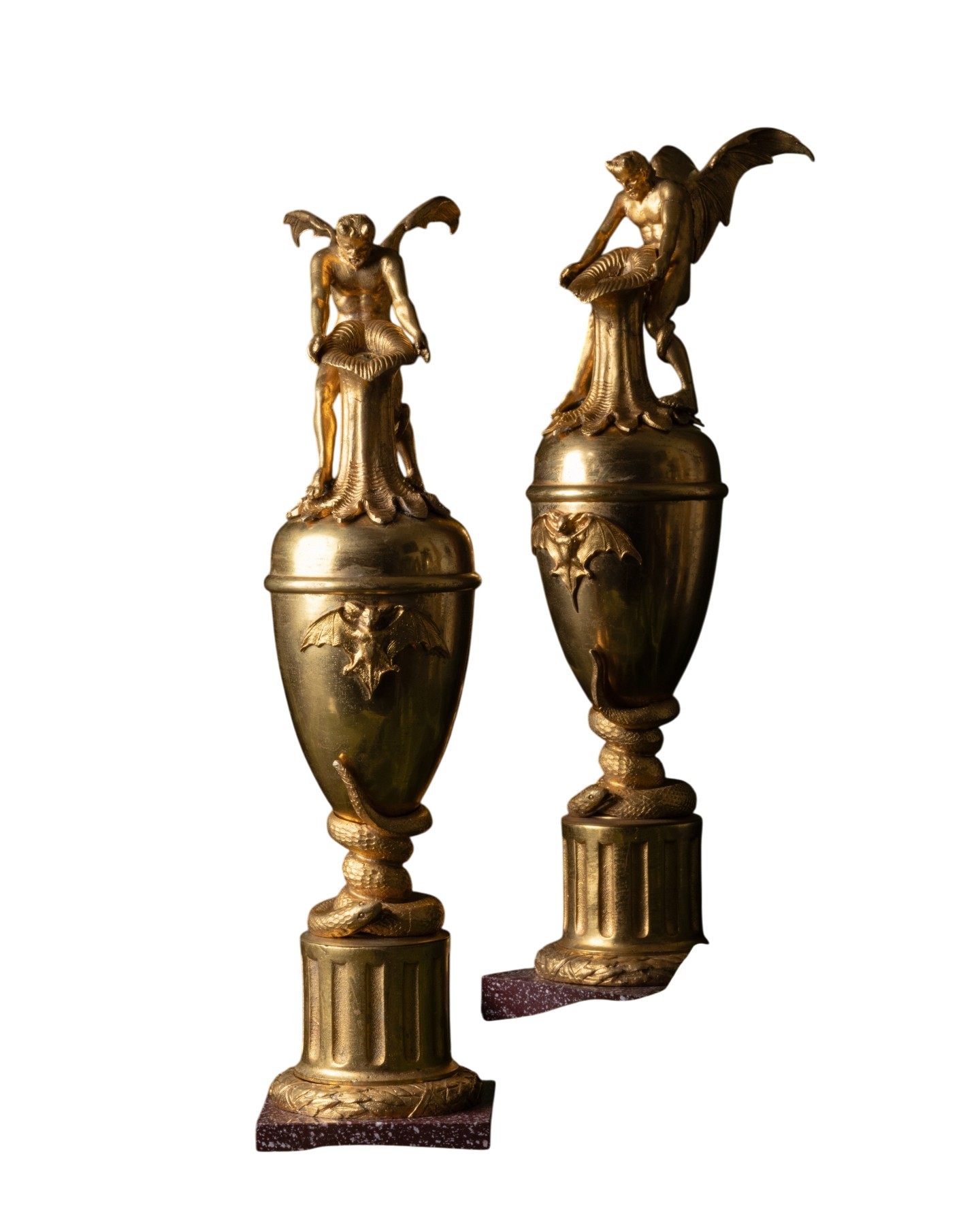 La présente paire de vases décoratifs, avec sa dorure brillante et sa base en porphyre, diffère de la version sombre et patinée exposée au Louvre à côté du Satan qui, bien qu’elle fasse autorité, ne fait probablement pas partie de l’ensemble exposé en 1834. Avec ses figures diaboliques ailées et le serpent ...