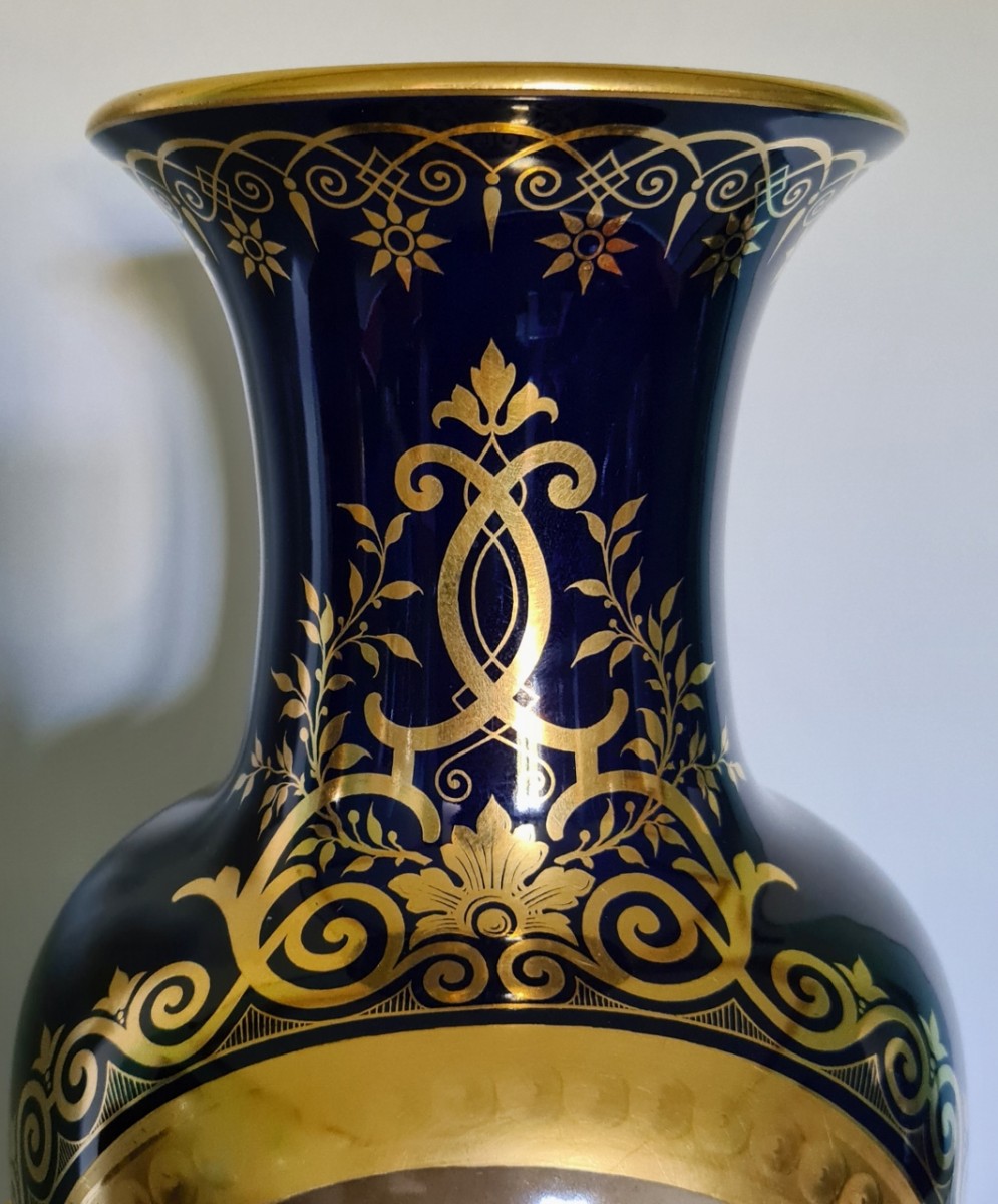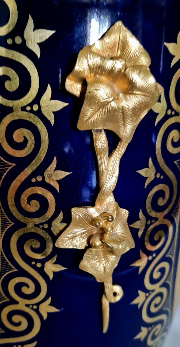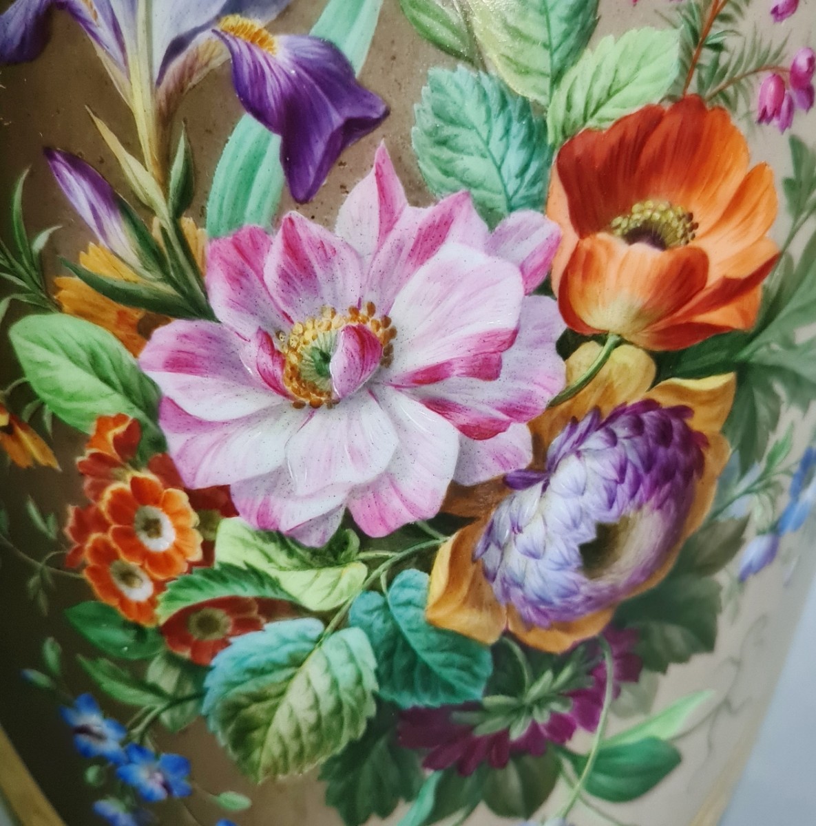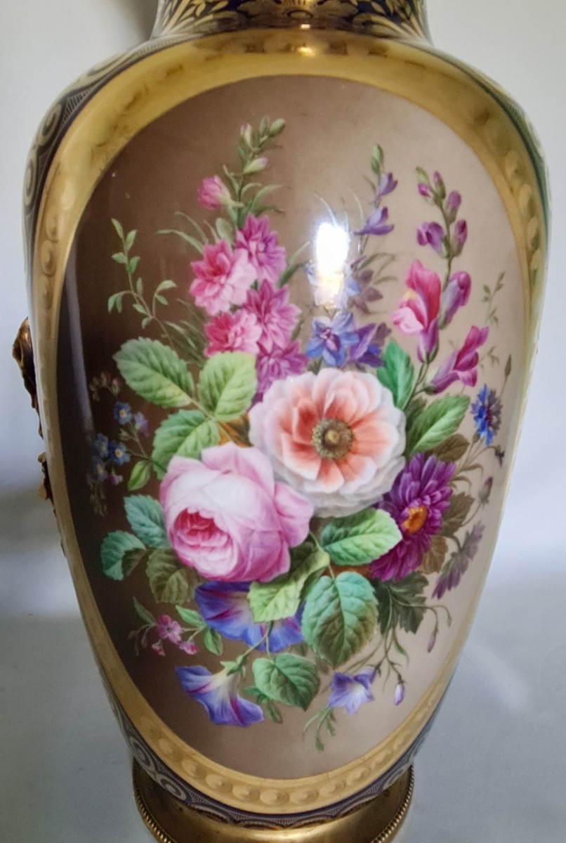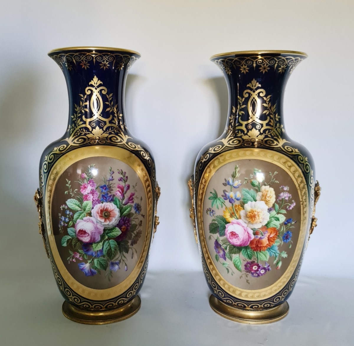 Cette grande paire de vases, en porcelaine, est peinte, sur un fond beige foncé, de grands bouquets de fleurs polychromes. Ils sont ordonnancés à l' intérieur de grandes resserves, ceintes d'un large ruban en or amati et brillant, orné d' une frise de pastilles. Le fond du vase, de couleur bleu nuit, est rehaussé d'un riche décor, de couleur or, constitué d'un mouvement en vague ponctué de fleurons qui court jusque sur le col. Ce dernier, orné d'un fleuron, présente de part et d'autre deux petites guirlandes de feuilles qui grimpent jusqu'au rebord, légèrement évasé. Ces ornements de très grande qualité ne sont pas sans rappeler la production prestigieuse de la manufacture de Sèvres. Ces vases reposent sur un très élégant socle en bronze doré bordé de deux rangées de perles, et sur la panse entre les réserves, se trouvent en applique deux petites chutes en bronze doré figurant une brindille supportant quelques feuilles de lierres.