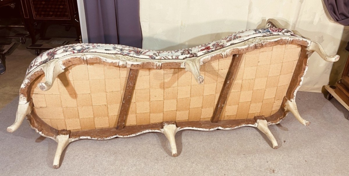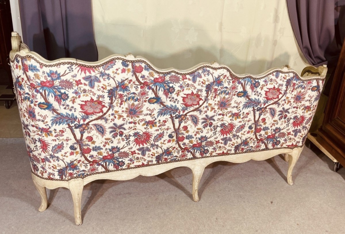 Canapé asymétrique dit "veilleuse" , XVIIIe Siècle en bois mouluré, sculpté et peint de forme mouvementée à décor de cartouches feuillagées et de fleurs, le dossier chantourné, reposant sur 8 pieds cambrés et terminés en feuilles d'acanthe.
