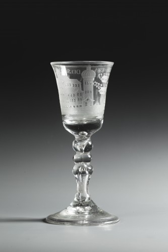 La coupe est décorée tout autour d’une gravure à la roue finement exécutée, représentant un château ou une maison de campagne entourée d’arbres et d’autres éléments de paysage. Au-dessus de cette scène figure l’inscription : « Welvaren van dezen huyse » (« Prospérité à cette maison »). De telles inscriptions étaient typiques des verres commémoratifs du XVIIIe siècle, avec lesquels on souhaitait la prospérité ou la bonne fortune à une maison ou à une famille. Ces verres étaient souvent réalisés ...