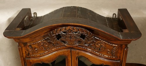 Ce modèle est assez exceptionnel par la richesse de son ornementation sculptée. Coiffé d'une corniche (indépendante et s'emboîtant à la traverse haute par deux tenons), ouvrant par deux portes (ce qui est plus rare encore) mais aussi deux tiroirs en partie basse, il prend véritablement des airs d'armoire ...