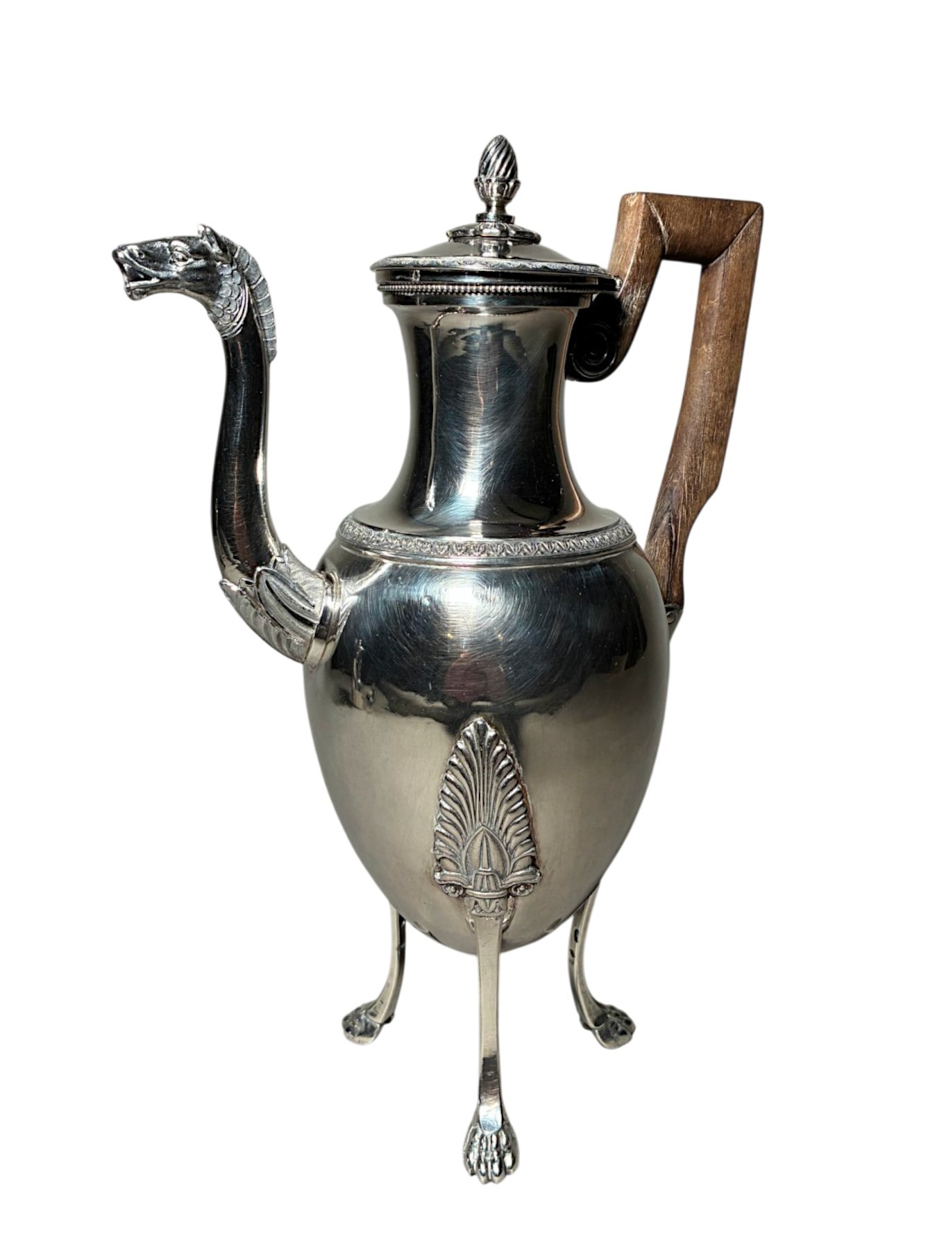 Verseuse en argent massif, de forme ovoïde reposant sur 3 pieds en applique à décor de palmes et se terminant par des pattes de lion