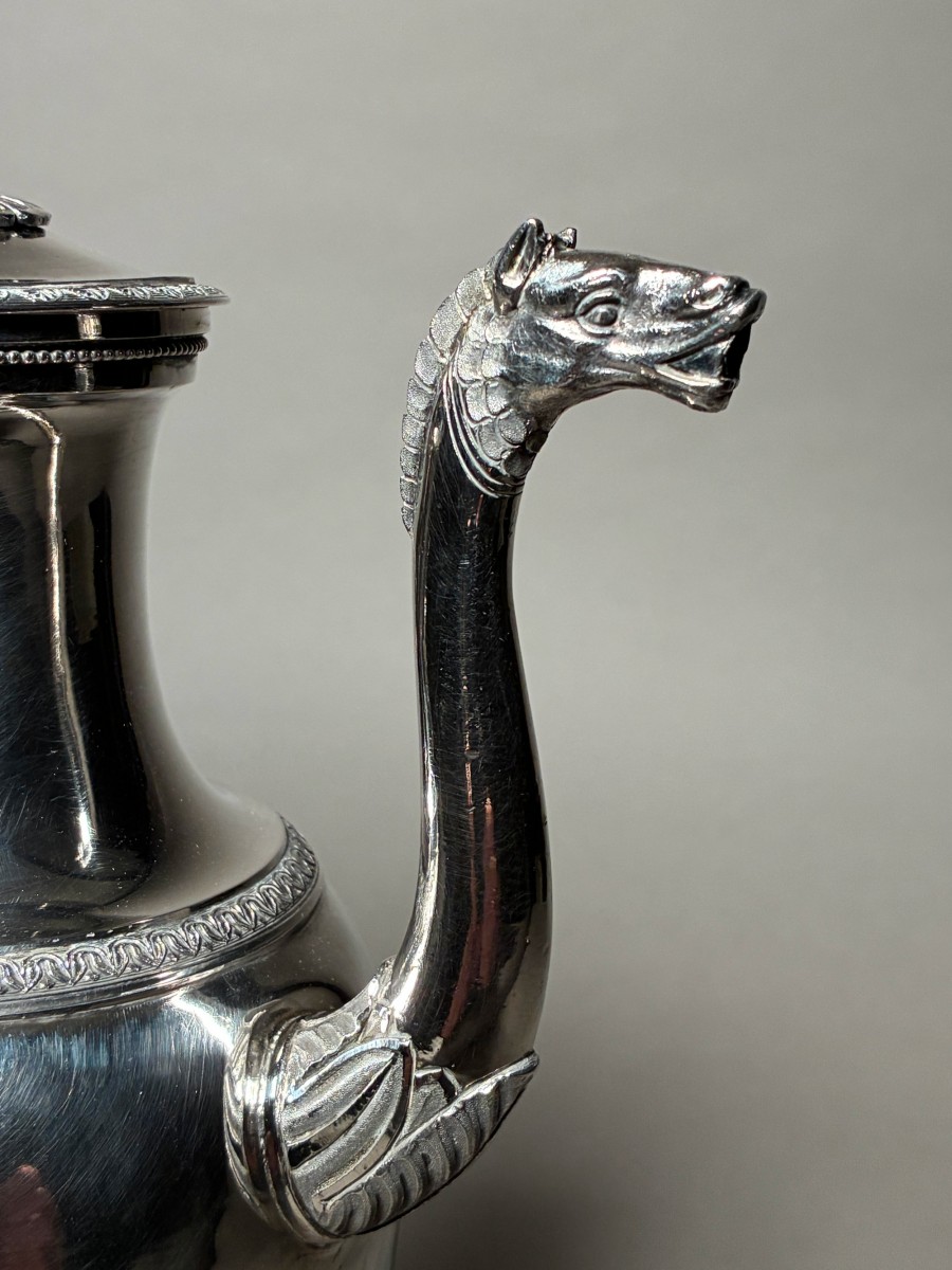 Elle est agrémentée d'une frise de laquelle part le bec verseur qui se termine par une tête de cheval.