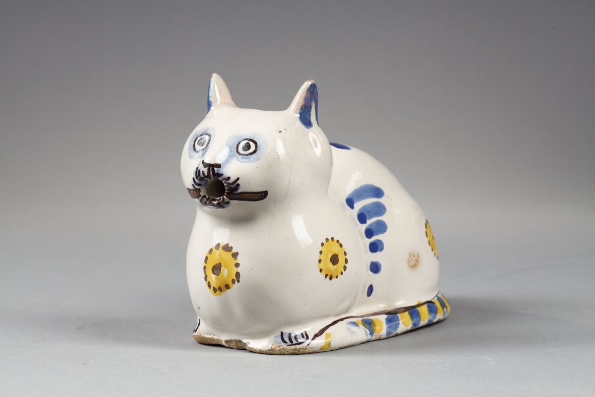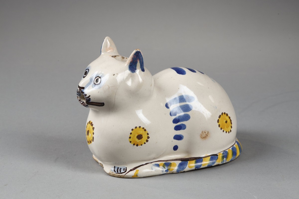 Nevers : Figurine en faïence formant verseuse zoomorphe représentant un chat couché décoré dans le style " A compendiario " en bleu, ocre et manganèse sur fond blanc inspiré des productions italiennes de Faenza et de Deruta