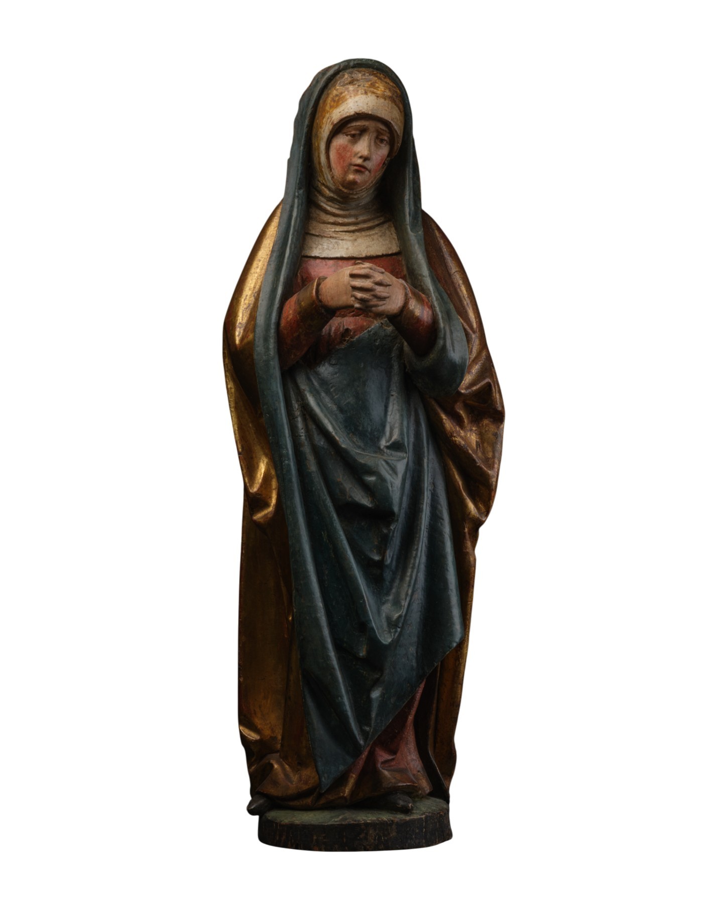 Représentée les mains jointes, la Vierge adopte une attitude de recueillement poignant. L’inclinaison douce de la tête, son regard assombri et sa bouche fermée aux commissures délicatement tombantes traduisent une émotion retenue, une douleur pudique mais intensément ressentie. Ce détail caractéristique marque son visage d’une tristesse profonde et permet d’identifier cette figure comme une Vierge de Calvaire. Admirablement sculpté, son visage incarne la sensibilité particulière des ateliers souabes, capables d’insuffler à leurs figures une humanité profonde et immédiatement touchante. Elle devait originellement prendre place au pied d’un Calvaire, en pendant à la figure de saint Jean, complétant ainsi un groupe sculpté consacré à la Crucifixion.