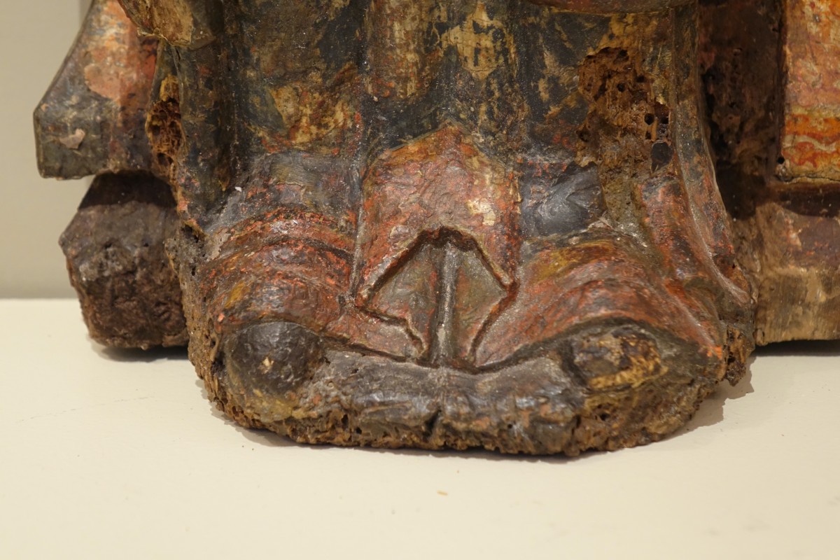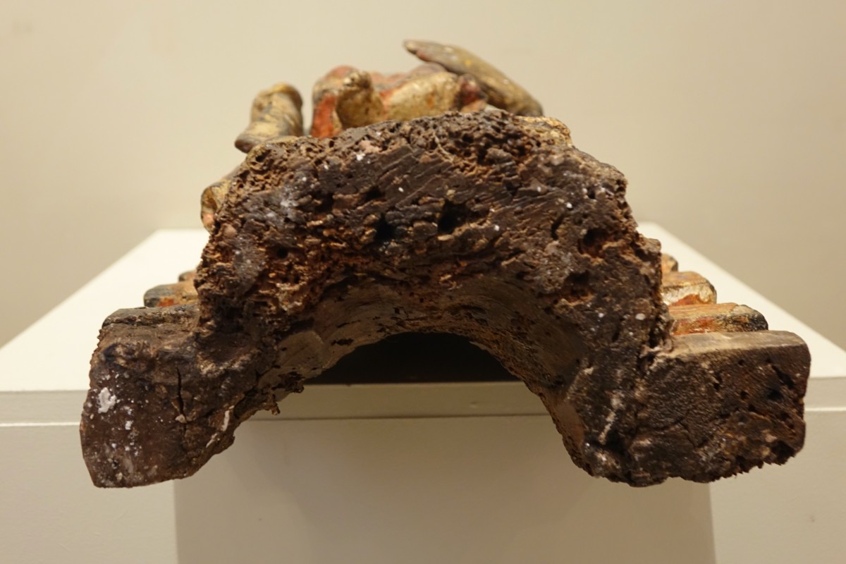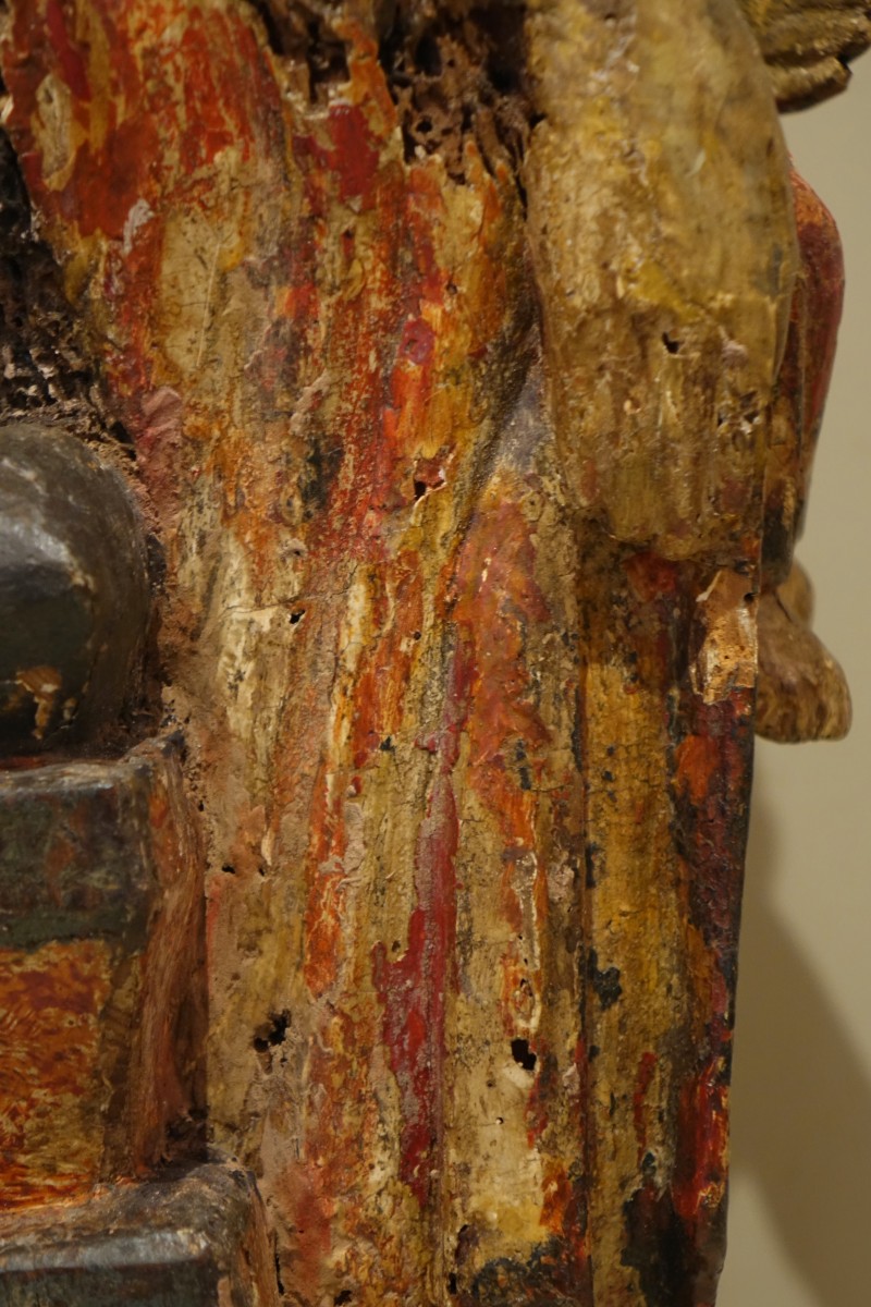 Les deux éléments de côté figurant le trône rapportés postérieurement, peut être dû à un dommage lors d'une attaque xylophage .