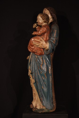 Vierge à l’Enfant en bois sculpté et polychrome. Déhanchée, Marie tient son fils sur son bras gauche tandis que son regard se porte sur les fidèles, la main droite ouverte : « Voici le fils de Dieu ». Celui-ci, de par son habit et son visage, est traité comme un homme.