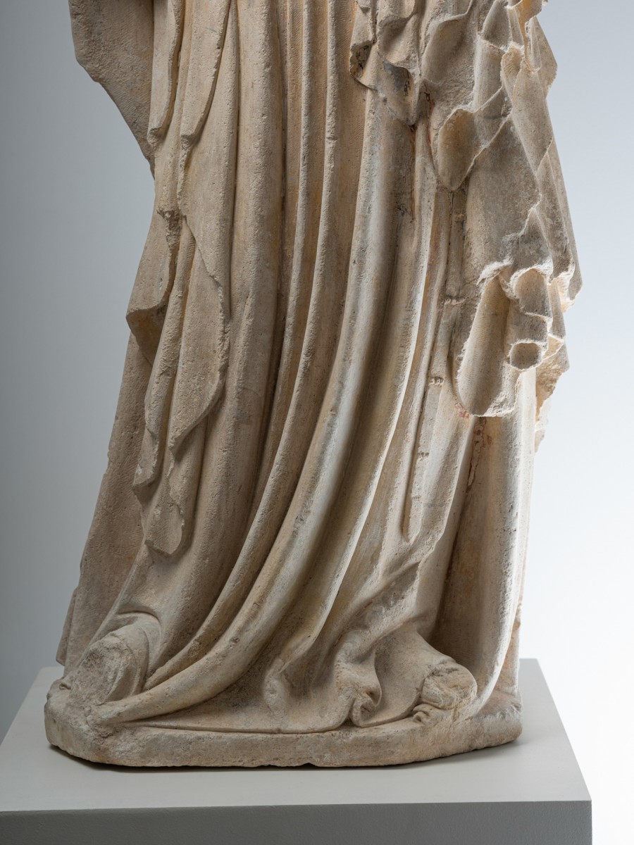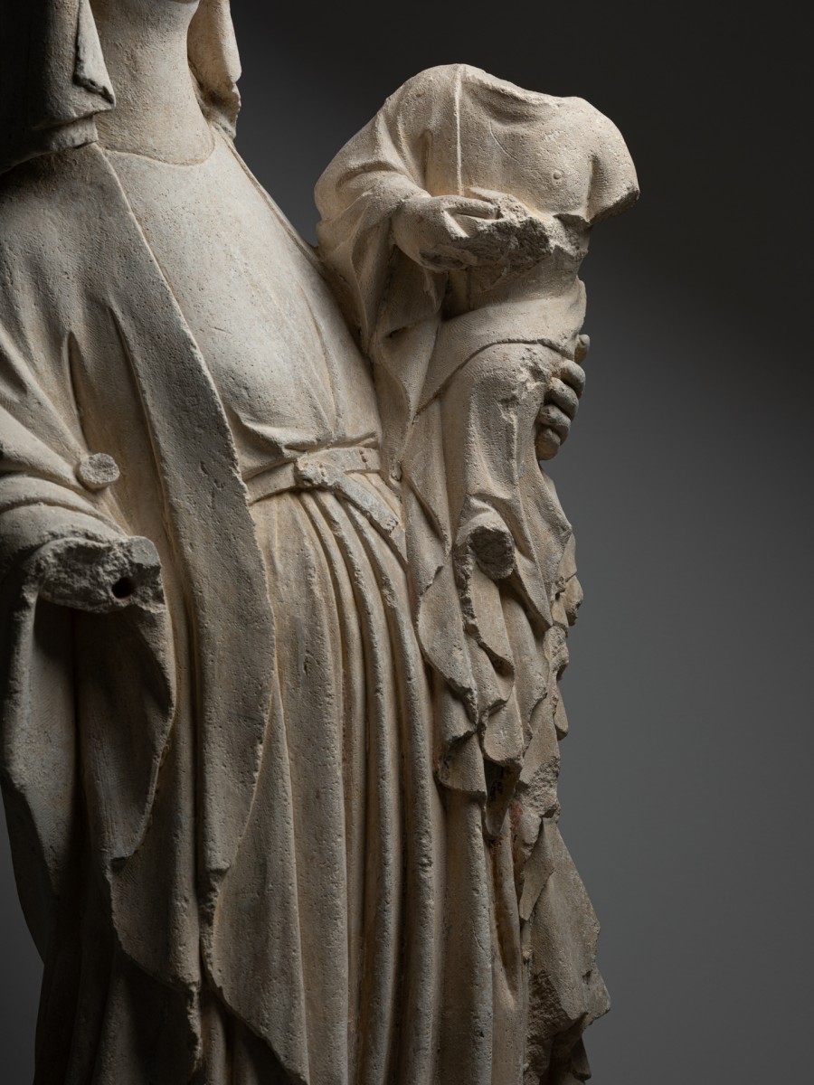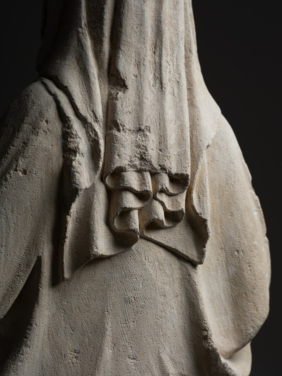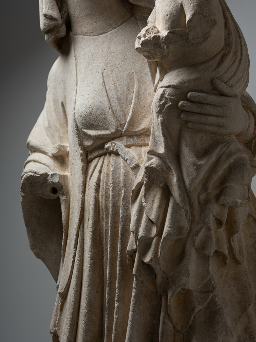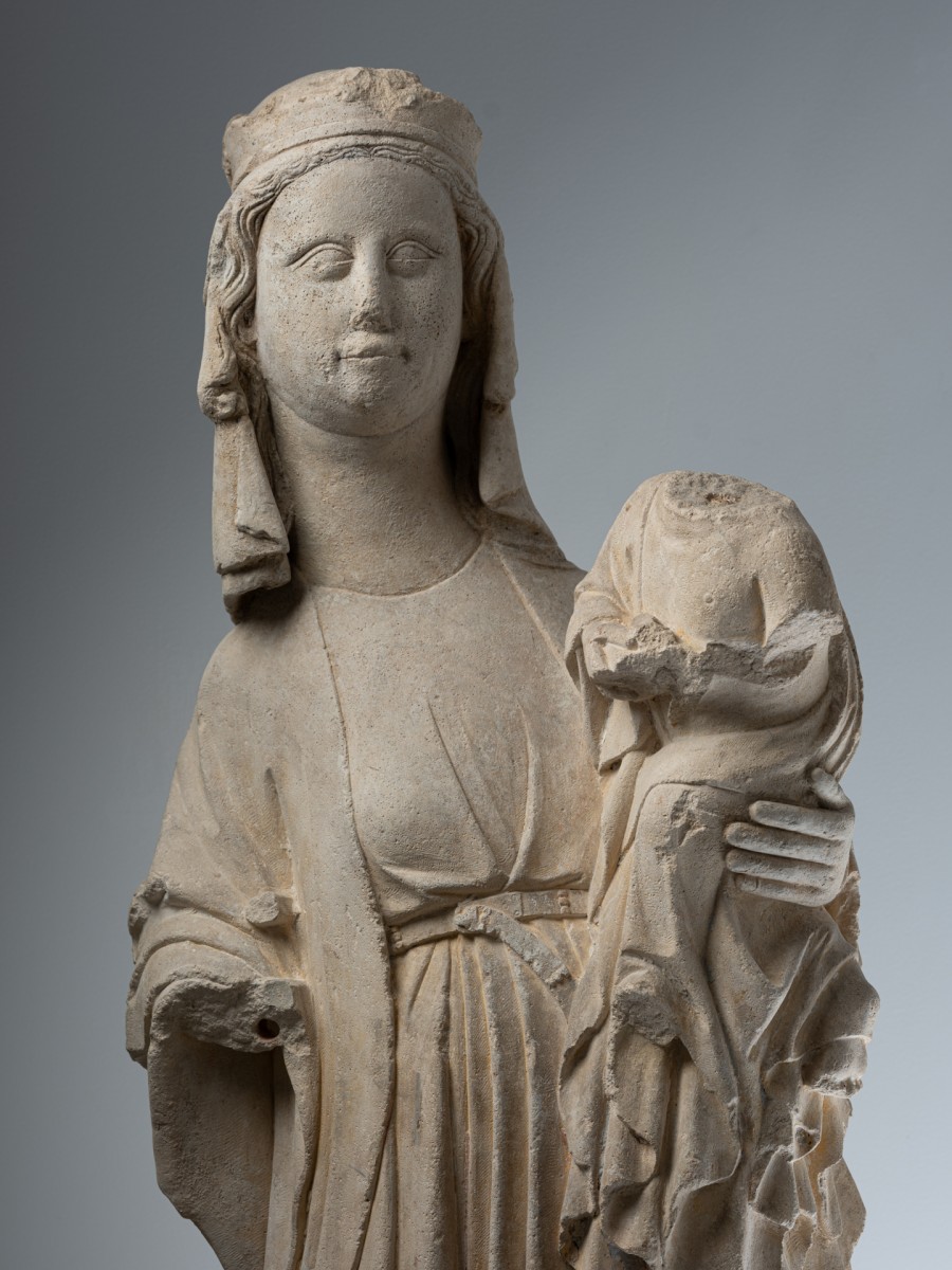 La tête de l’Enfant est aujourd’hui manquante, lacune fréquente dans la statuaire mariale médiévale. Les épisodes d’iconoclasme ont souvent visé prioritairement la figure du Christ, image directe de Dieu, tandis que la Vierge était plus volontiers épargnée. Le corps de l’Enfant, à demi-nu, est enveloppé dans un drapé foisonnant, dont la prolifération de plis se prolonge et se fond dans ceux de la robe de la Vierge, créant une continuité plastique entre les deux figures et renforçant leur unité symbolique.