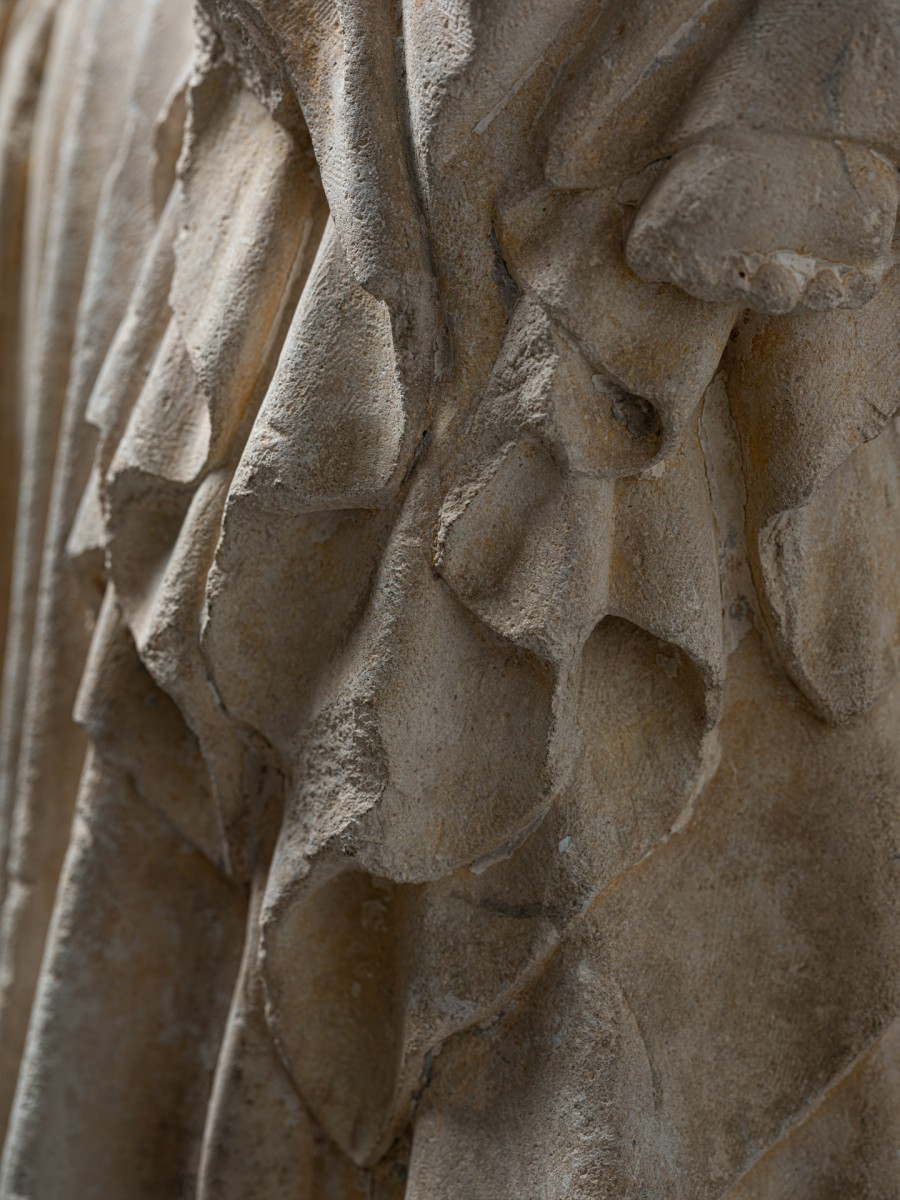 Le manteau, posé sur les épaules, est ouvert et dégage la poitrine, laissant apparaître une robe ceinturée. La ceinture constitue ici un élément iconographique essentiel : placée haut sur la taille, elle est partiellement dissimulée par la figure de l’Enfants. Elle accompagne le mouvement du corps et contribue à structurer la verticalité de la composition. Dans l’iconographie mariale, la ceinture renvoie traditionnellement à la chasteté et à la pureté de la Vierge, tout en soulignant la séparation symbolique entre le haut du corps, siège de l’esprit, et la partie inférieure, plus charnelle. Le voile très court, mais à chutes amples, est retenu par un simple diadème, attribut discret de la dignité royale de Marie.