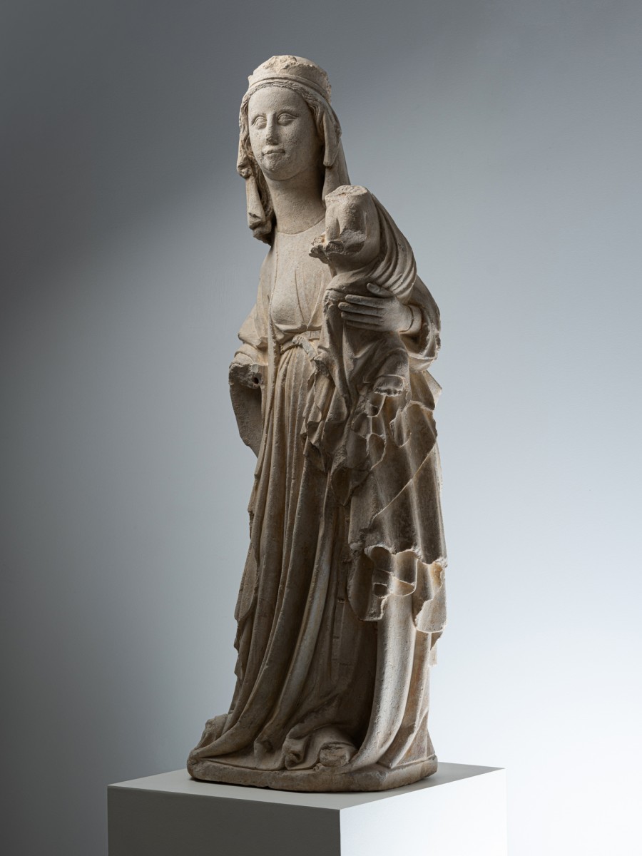 Cette Vierge à l’Enfant est une sculpture médiévale remarquable, datée du tout début du XIVe siècle, et attribuable à un atelier lorrain. Taillée dans un calcaire très fin et tendre, elle témoigne de la grande qualité technique atteinte par les sculpteurs de cette région, alors particulièrement active sur le plan artistique. De légères traces de polychromie subsistent dans les plis les plus prononcés, rappelant que ces sculptures étaient à l’origine peintes et destinées à une perception visuelle riche et expressive.