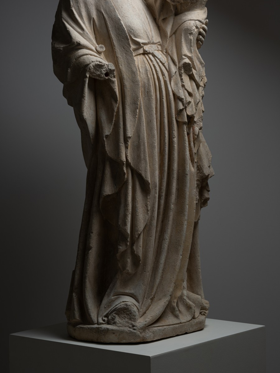 Cette oeuvre reflète également les échanges culturels intenses dont bénéficiait la Lorraine à cette époque, sous la domination des comtes de Bar, en lien avec les régions germaniques, les Flandres et l’Angleterre. L’influence germanique se perçoit dans la solidité des volumes, la densité plastique et la présence spatiale affirmée de la figure, tout en restant profondément ancrée dans une tradition locale. Probablement destinée à une église paroissiale, une cathédrale ou une chapelle monastique, elle illustre la fonction dévotionnelle de ces sculptures, conçues comme des supports de méditation et de prière.