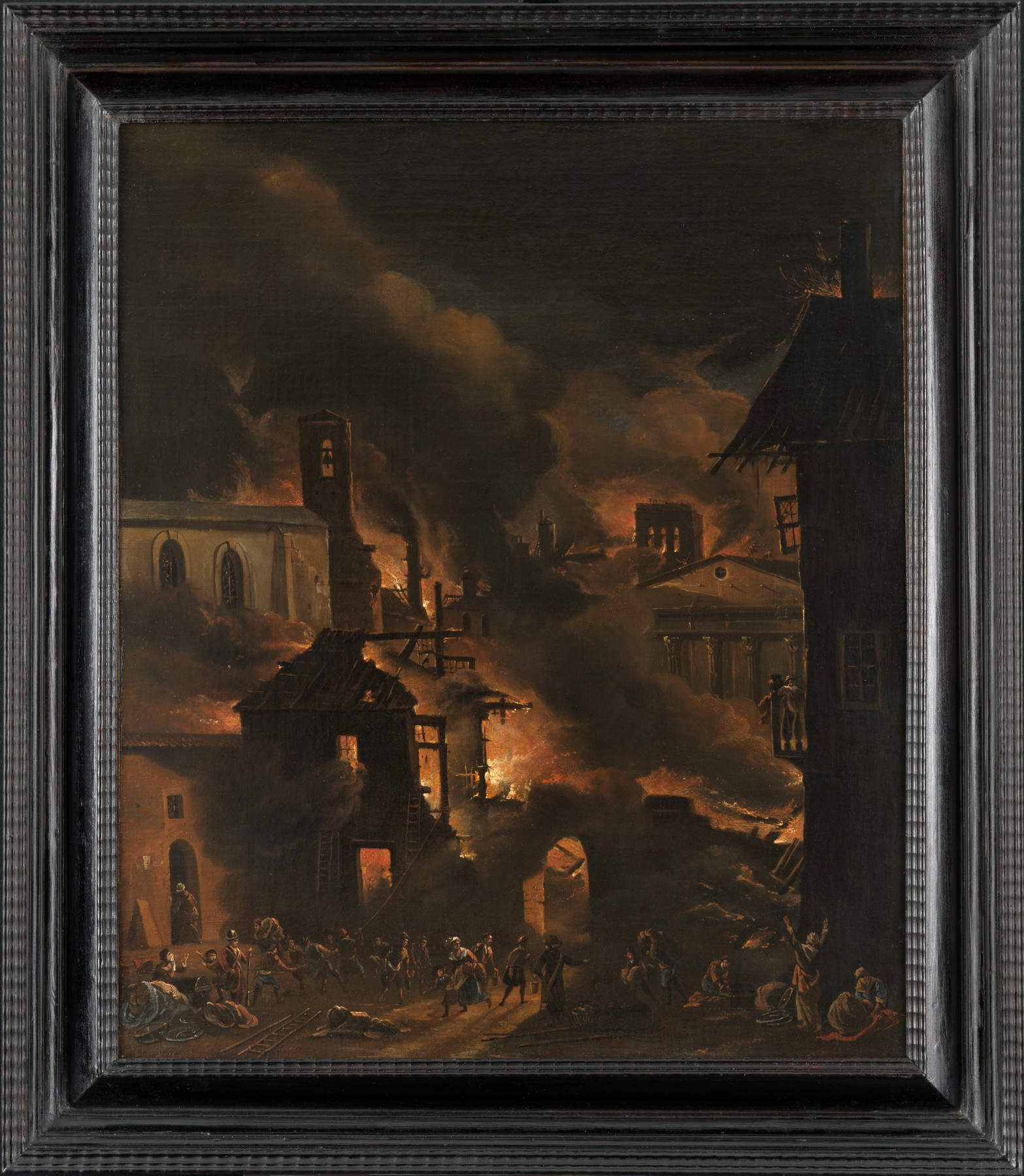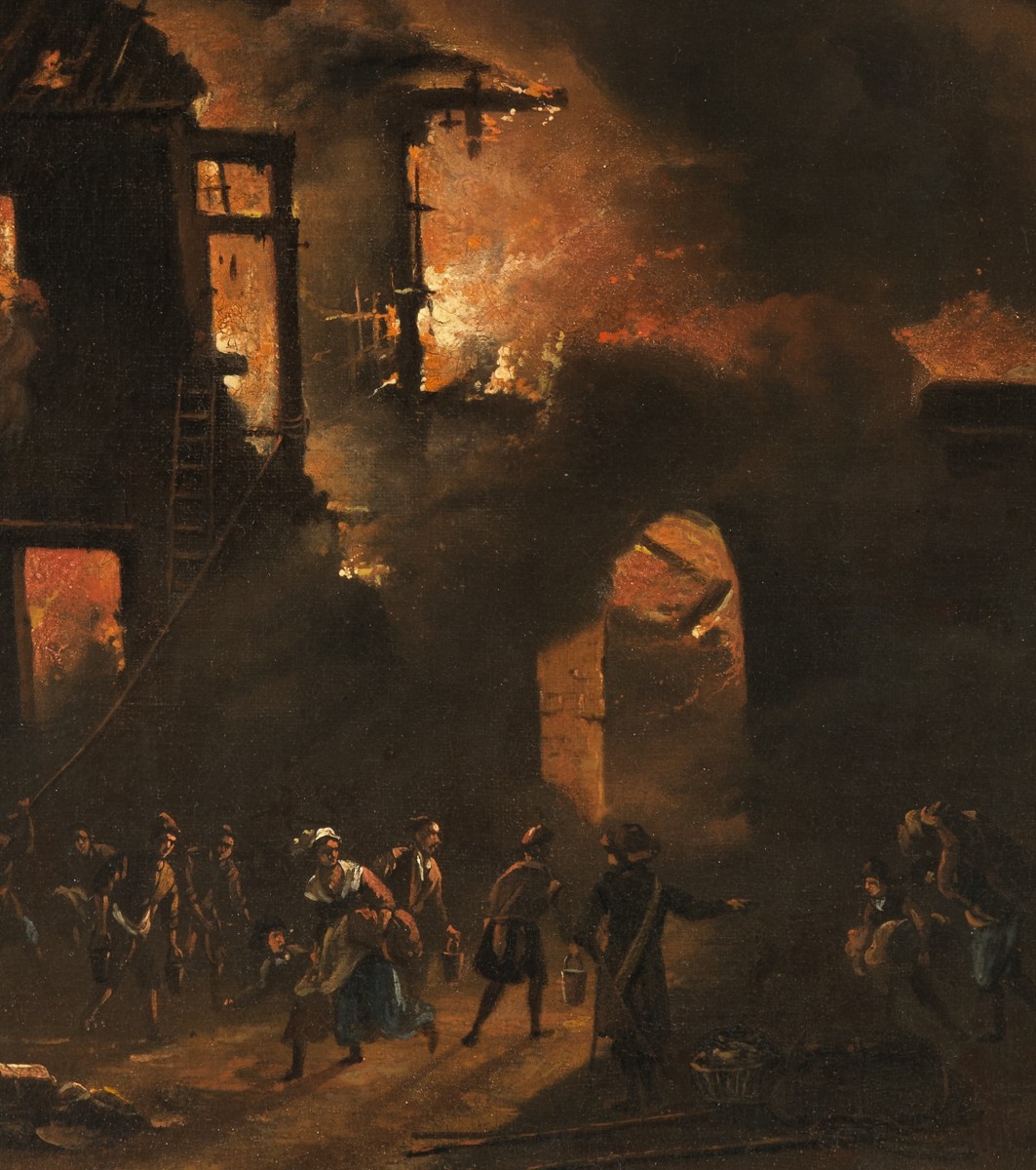 Une foule de personnages s’active au premier plan, les uns munis de seaux pour éteindre l’incendie, les autres tentant de sauver ce qui peut l’être. A droite et à gauche, des femmes lèvent les bras au ciel invoquant le divin pour les protéger de cette calamité.