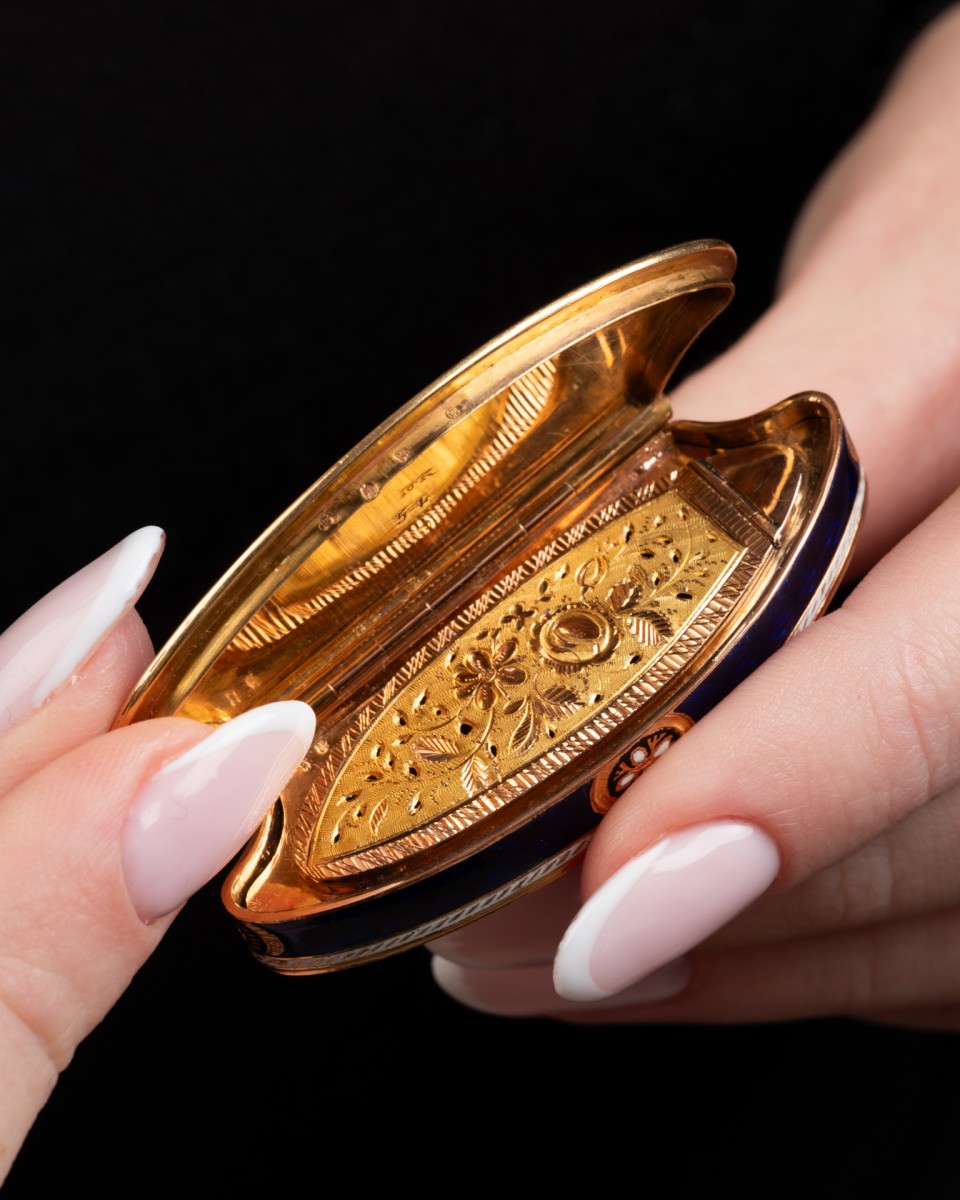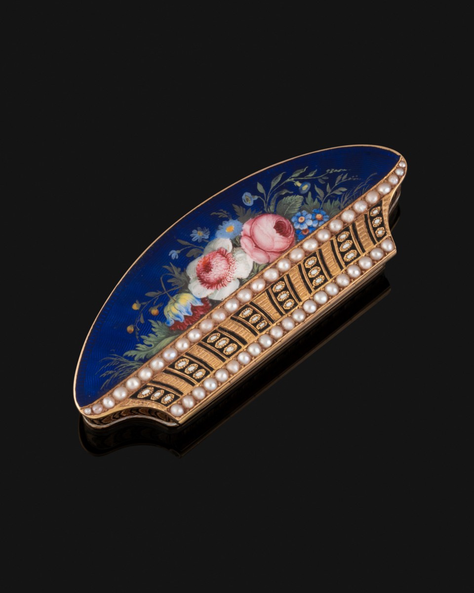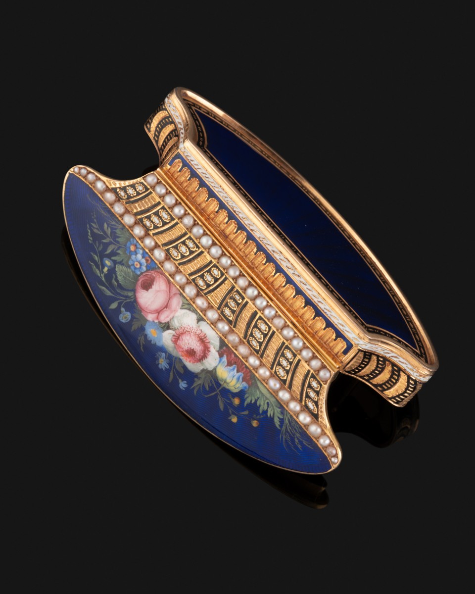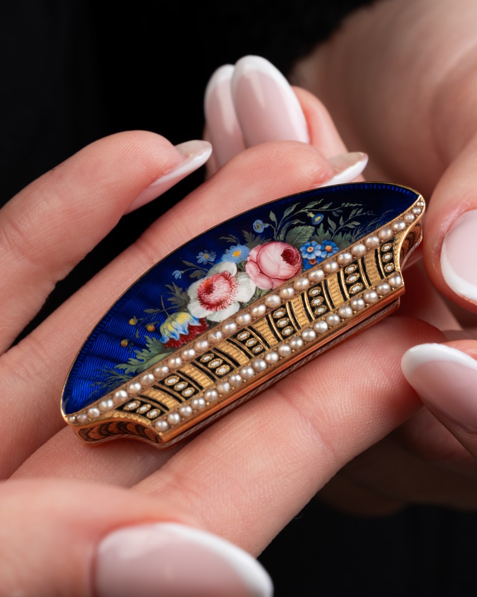 Le couvercle est orné d'un bouquet de fleurs polychromes posé sur un panier souligné de deux rangs de perles fines et d'émail noir alternant avec de l'or ciselé et des pois blanc.