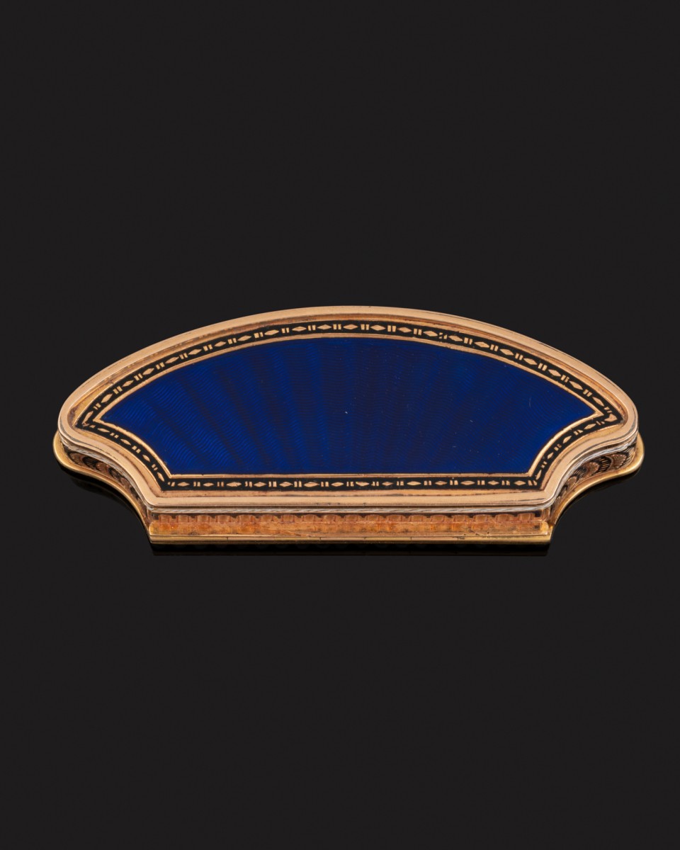 Elle est entièrement émaillée de bleu sur un fond guilloché en soleil.