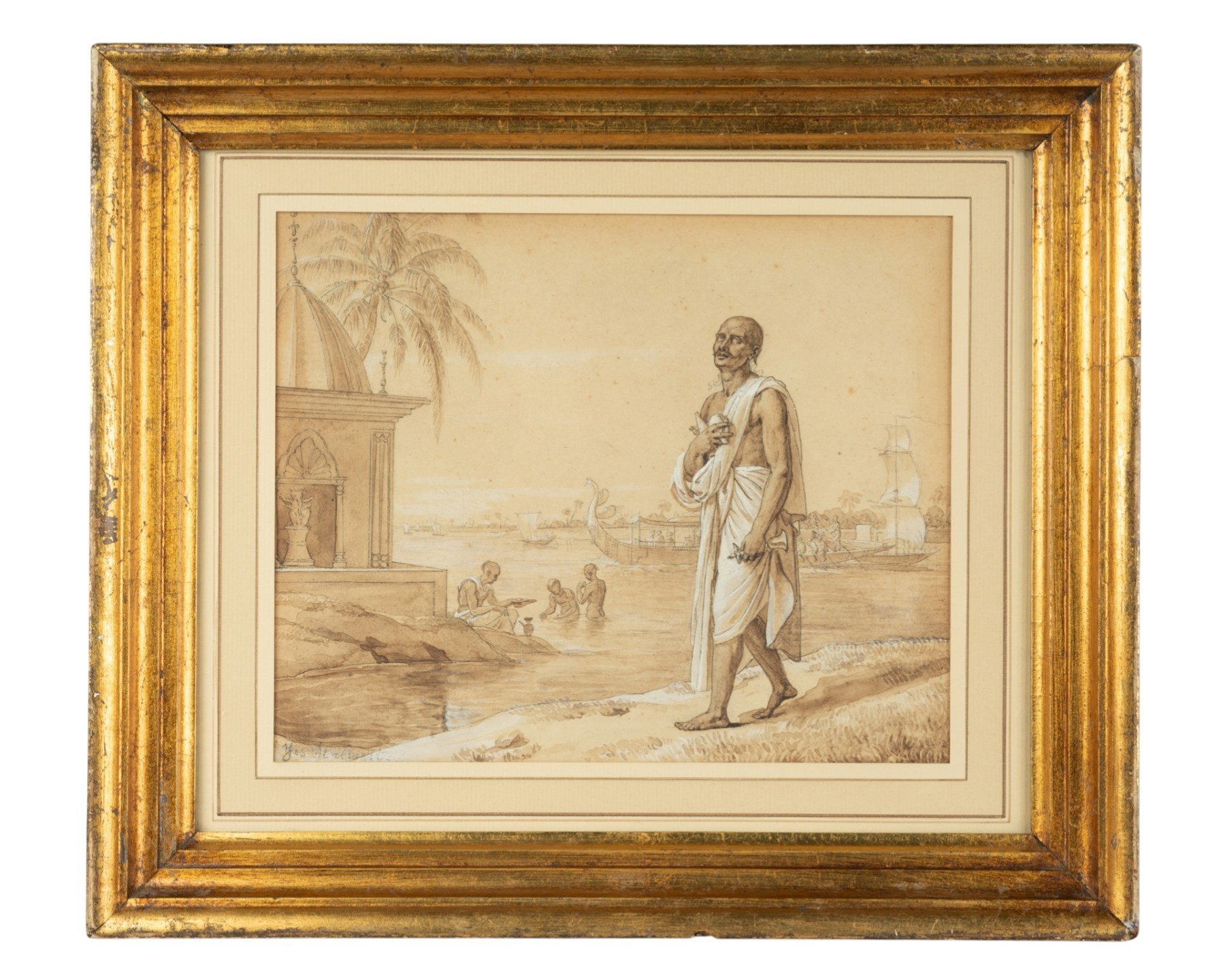 Ce délicat dessin au lavis représente une scène paisible sur les rives du Gange, fleuve sacré de l’Inde. Au premier plan, un homme indien vêtu d’un dhoti traditionnel marche pensivement le long de la berge, la main droite posée sur la poitrine dans un geste évoquant la dévotion et la contemplation. À gauche s’élève une petite structure temple, dont une niche abrite une statue de Ganesh, tandis que d’autres figures accomplissent des ablutions rituelles dans le fleuve. À l’arrière-plan, des barques et des voiliers animent la surface calme de l’eau, baignée d’une lumière doucement diffusée.