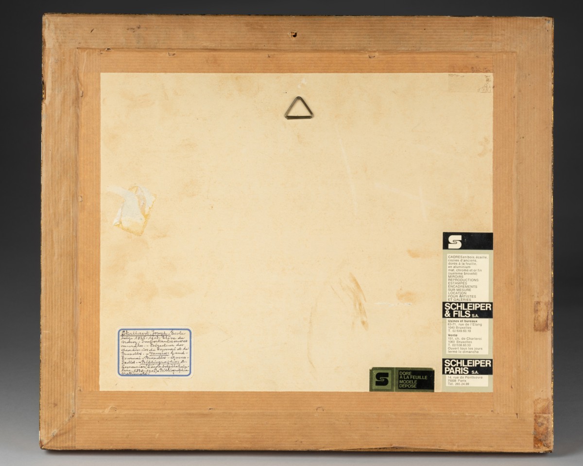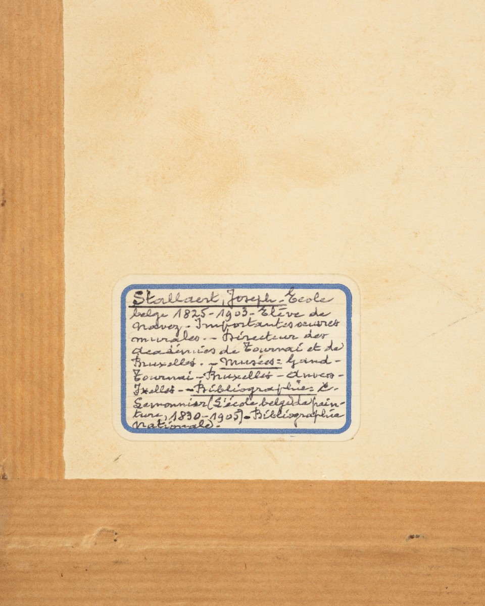 Exécuté au lavis, technique particulièrement adaptée aux études préparatoires, le dessin témoigne de la maîtrise de Stallaert dans le contrôle du trait et la modulation des tonalités. La monochromie subtile renforce l’atmosphère contemplative, tandis que la précision du traitement anatomique, des proportions et de la perspective atteste d’une formation académique rigoureuse. Le jeu nuancé de la lumière confère profondeur et cohérence spatiale sans recourir à des contrastes dramatiques.