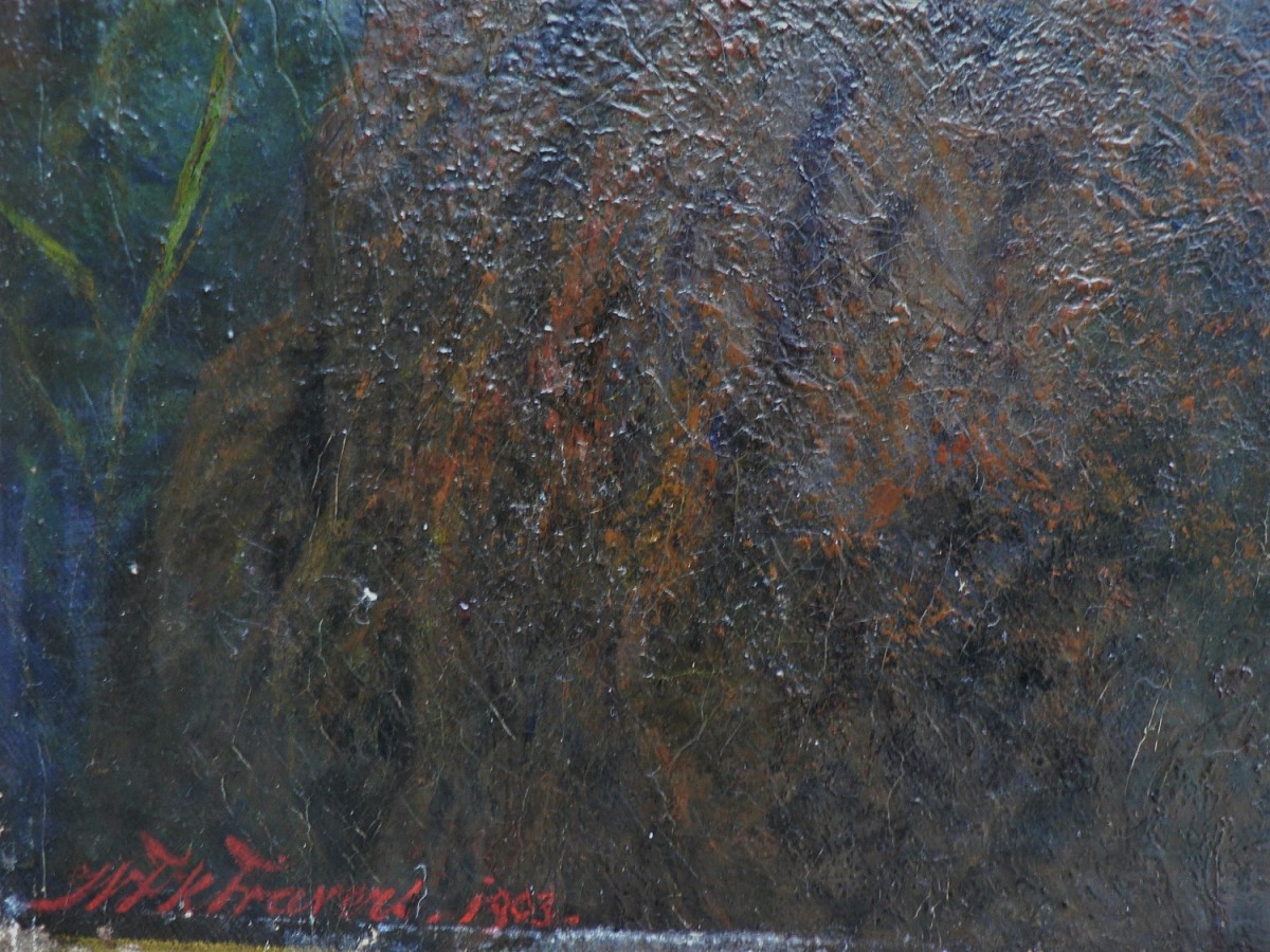 Huile sur toile signée en bas à gauche, en rouge : "W.F.K Travers 1903". Cette peinture de William Travers illustre avec brio les préoccupations esthétiques de l'époque. Le choix de couleurs vives et la touche légère utilisée par l'artiste témoignent de son désir de capturer la beauté de la nature et de la vie quotidienne. La jeune femme représentée, cueillant des fleurs et se prélassant au soleil, est une allégorie de l'harmonie entre l'homme et son environnement. Néanmoins, la menace du Vésuve, visible au loin avec sa fumée s'échappant de son sommet, rappelle que l'homme n'est jamais à l'abri des forces destructrices de la nature. Bien que la peinture ait été réalisée plusieurs années avant l'éruption de 1906 qui fit plus de 100 victimes et éjecta plus de lave que jamais, il est intéressant de constater que Travers n'a pas cherché à inclure cette tragédie dans son oeuvre. Au contraire, il a choisi de représenter une vue idéale de la côte ...