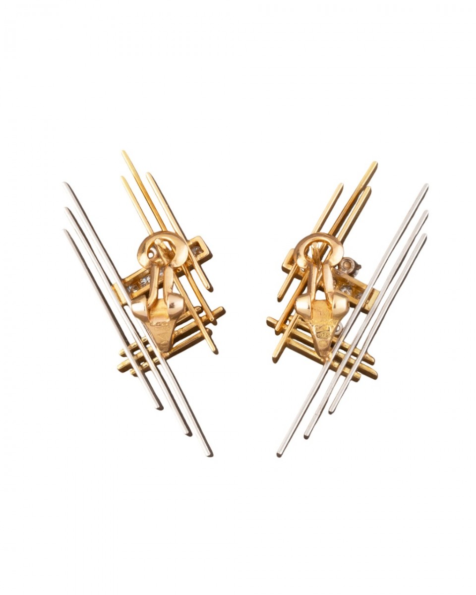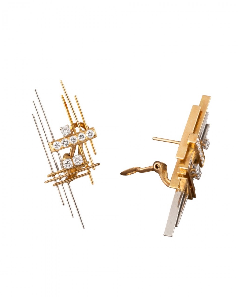 WOLFERS, années 1970 Paire de boucles d'oreilles en or jaune 18k et platine à lignes géométriques asymétriques, rehaussées de diamants taille brillant. Systèmes pour oreilles percées, tiges et raquettes de sécurité en or 18k.